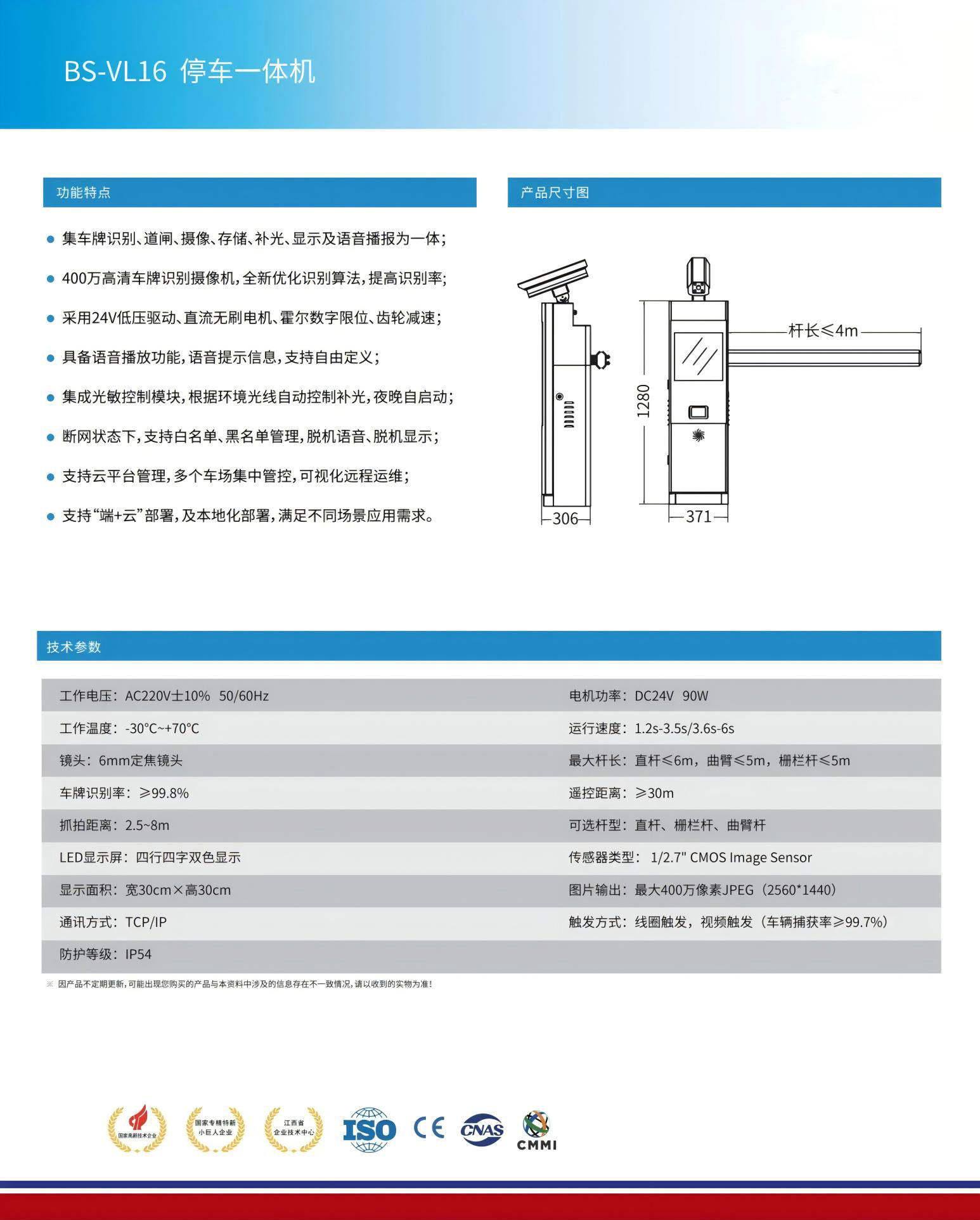 ●集車牌識(shí)別、道閘、攝像、存儲(chǔ)、補(bǔ)光、顯示及語(yǔ)音播報(bào)為一體;